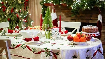 В украшении нужно придерживаться минимализма. Стол можно оформить в голубых, синих, серебристых, песочных, зеленых, белых или золотистых цветах. Его можно украсить ветками ели, шишками и лентами. Посуда должна быть деревянной.