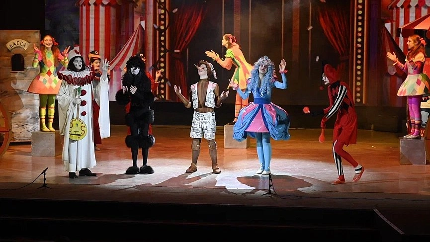 Новогоднее настроение на сцене культурного центра создавали лучшие творческие коллективы. Они подготовили для ребят увлекательную программу. Сначала детки посмотрели спектакль о приключениях Буратино, а затем стали участками большой интерактивной программы с Дедом Морозом и Снегурочкой.