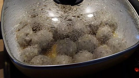 - Вылейте соус на обжаренные тефтели, накройте сковороду крышкой и тушите на слабом огне 30 минут.