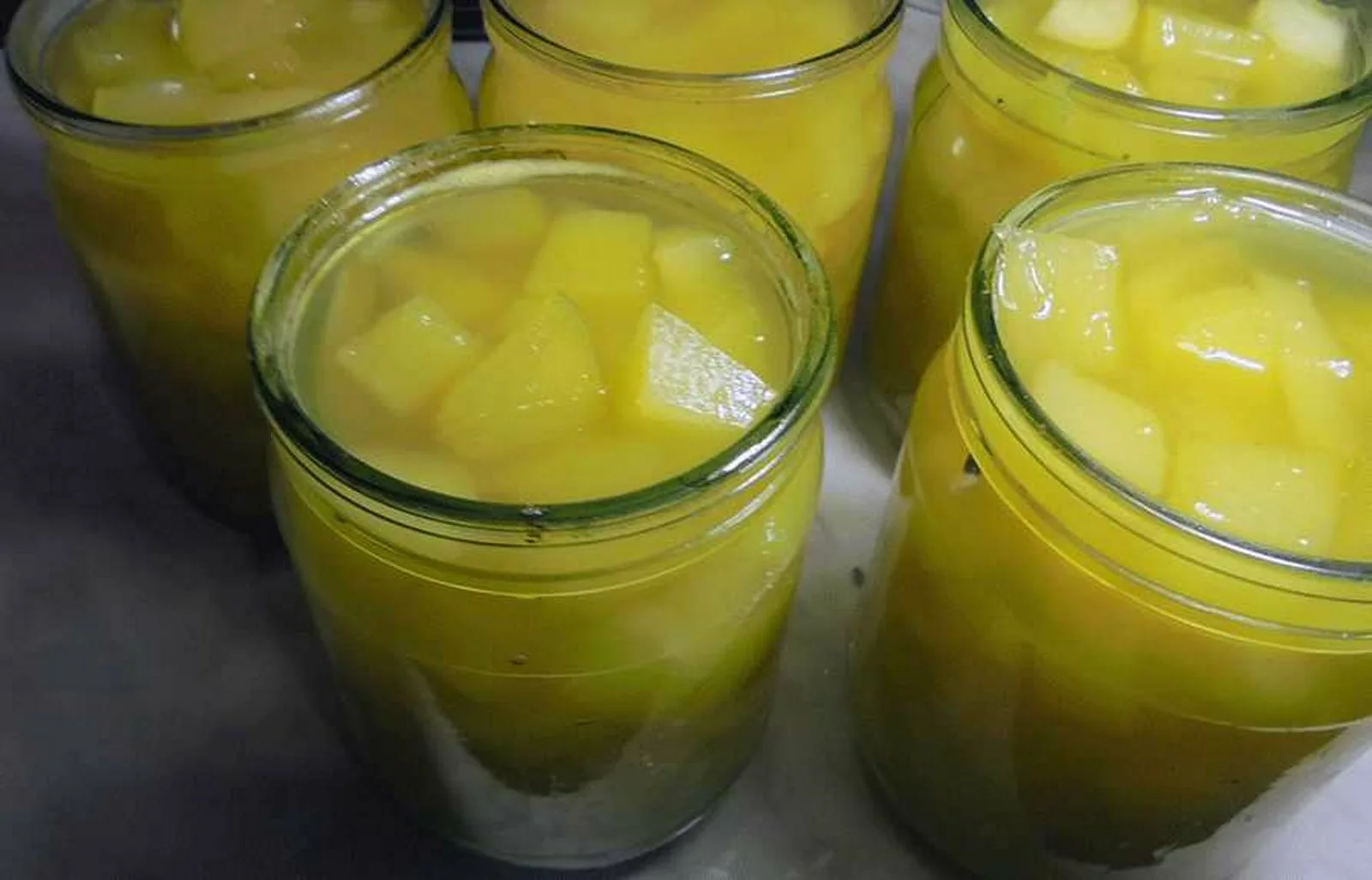 Самый убедительный вариант, где кабачки и настоящие ананасы варятся вместе. Несколько циклов нагревания и остывания в ананасовом сиропе творят чудеса: овощные кубики полностью перенимают вкус и текстуру фруктов. Такую роскошную заготовку не стыдно подать и к праздничному столу.
