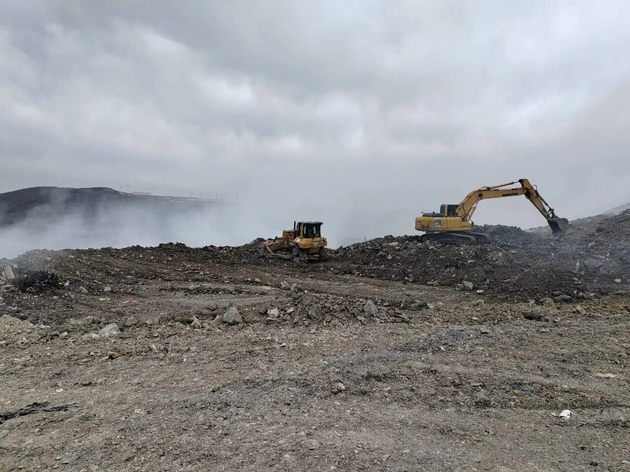 - Изоляция. Основная тактика — засыпка очагов грунтом, песком и негорючими материалами. Затем бульдозеры перемешивают этот материал с тлеющими отходами, чтобы перекрыть доступ кислорода и остановить процесс тления.