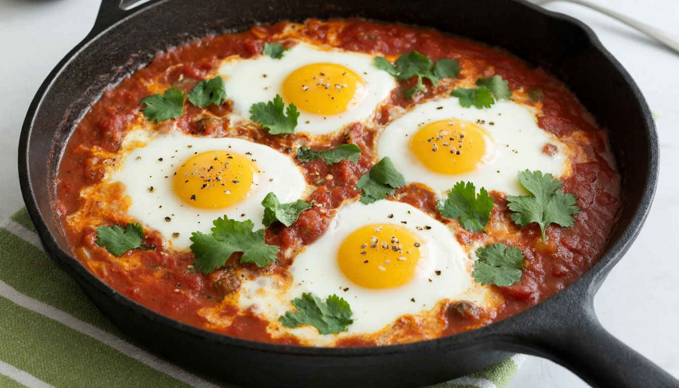 Ложкой делаем небольшие углубления в соусе и аккуратно вбиваем яйца. Важно сохранить желтки целыми. Накрываем крышкой и готовим 3-4 минуты на медленном огне. Белок должен схватиться, а желток остаться жидким — это идеал.