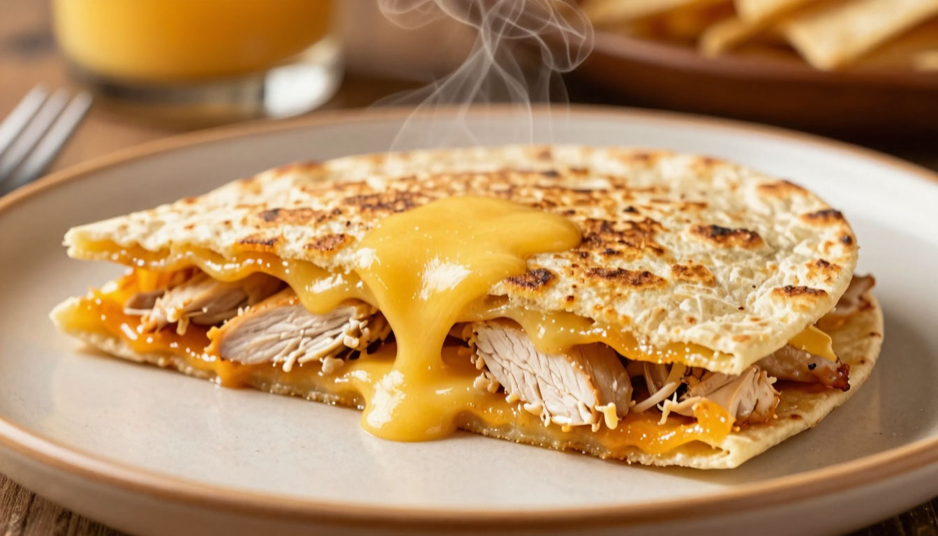 Это блюдо мексиканской кухни — нечто среднее между сэндвичем, лепёшкой и пиццией. Золотистые, хрустящие тортильи скрывают внутри фонтан расплавленного сыра и сочную курицу с овощами. А главное, от идеи до готового блюда на столе проходит не больше 20 минут.