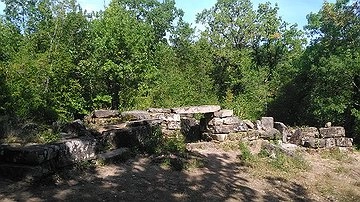 Второй дольменный комплекс расположен в 300 м ниже по течению Озерейки. Группа состоит из шести мегалитов. Вокруг дольменов сооружена стена из крупных плит. Место, надо сказать, жутковатое. Долго оставаться там не захотелось, да еще Сергей сказал, что внутри дольменов археологи обнаружили остатки погребений, датируемых концом 1 тыс. лет до н.э., в то время дольмены использовались как костехранилище.