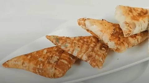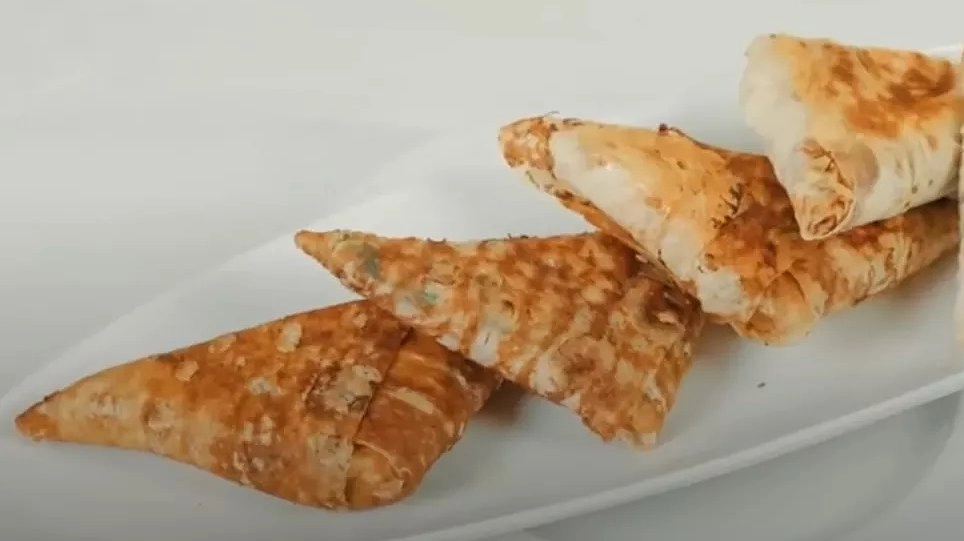 - На каждую полоску лаваша выложите начинку и аккуратно сверните в треугольники, заправляя концы лаваша.