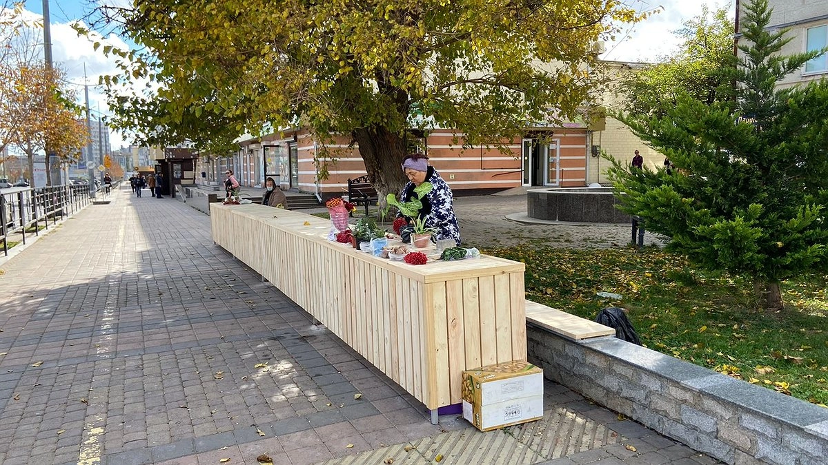 Пожилым людям стало гораздо удобнее размещать свой товар : к нему больше не нужно нагибаться. Раньше продавцы рассаживались прямо на каменной облицовке клумбы – теперь на ней оборудован дощатый настил.
