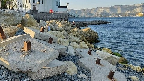 В Новороссийске на берегу моря возле храма благоверных князя Петра и княгини Февронии Муромских Чудотворцев появились кучи плит.