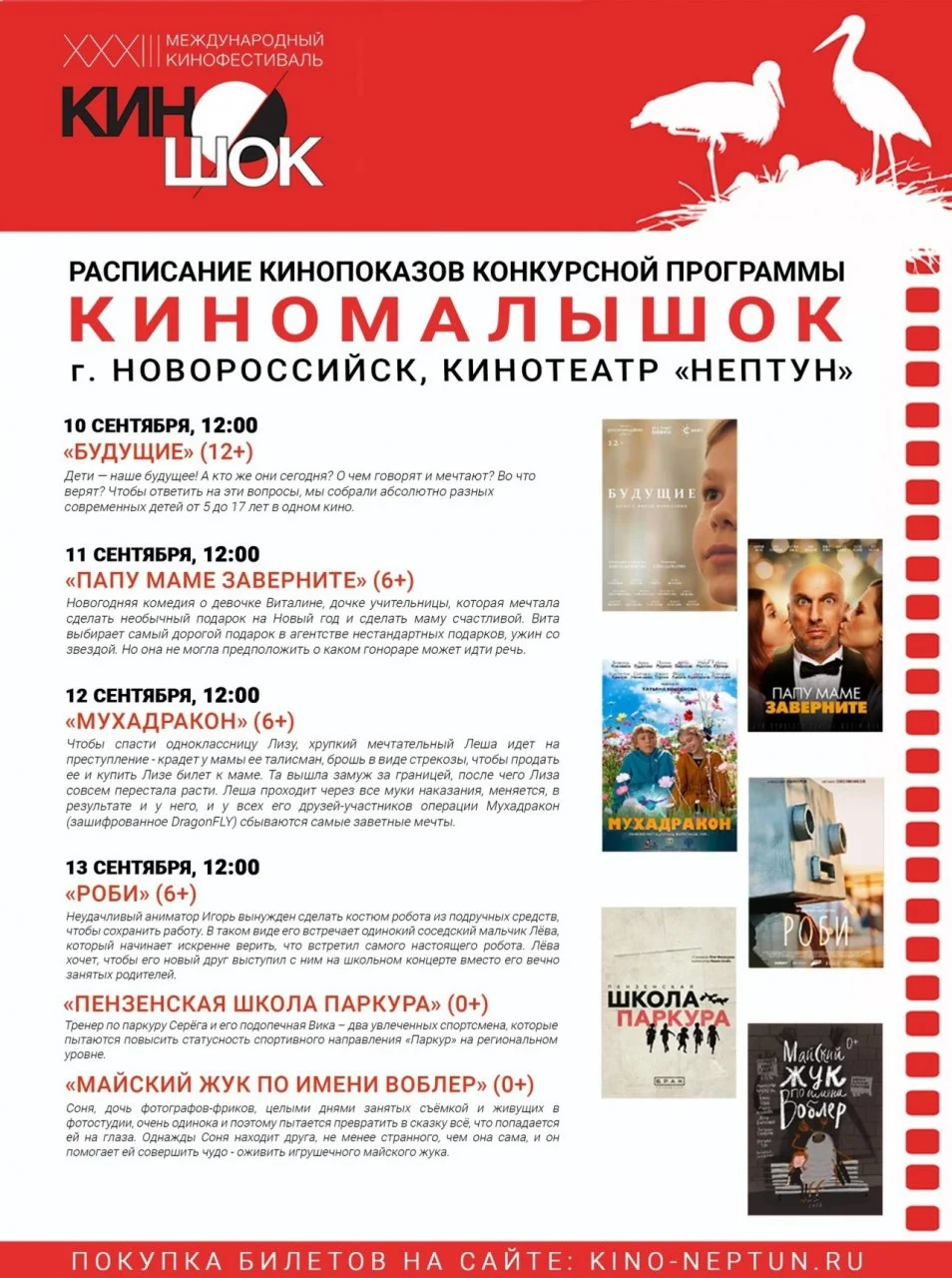 В рамках XXXIII открытого Международного кинофестиваля «КиноШОК» в Новороссийске состоится конкурс художественных фильмов для детей и подростков под названием «Киномалышок». Традиционно, площадкой для проведения конкурса станет кинотеатр «Нептун».