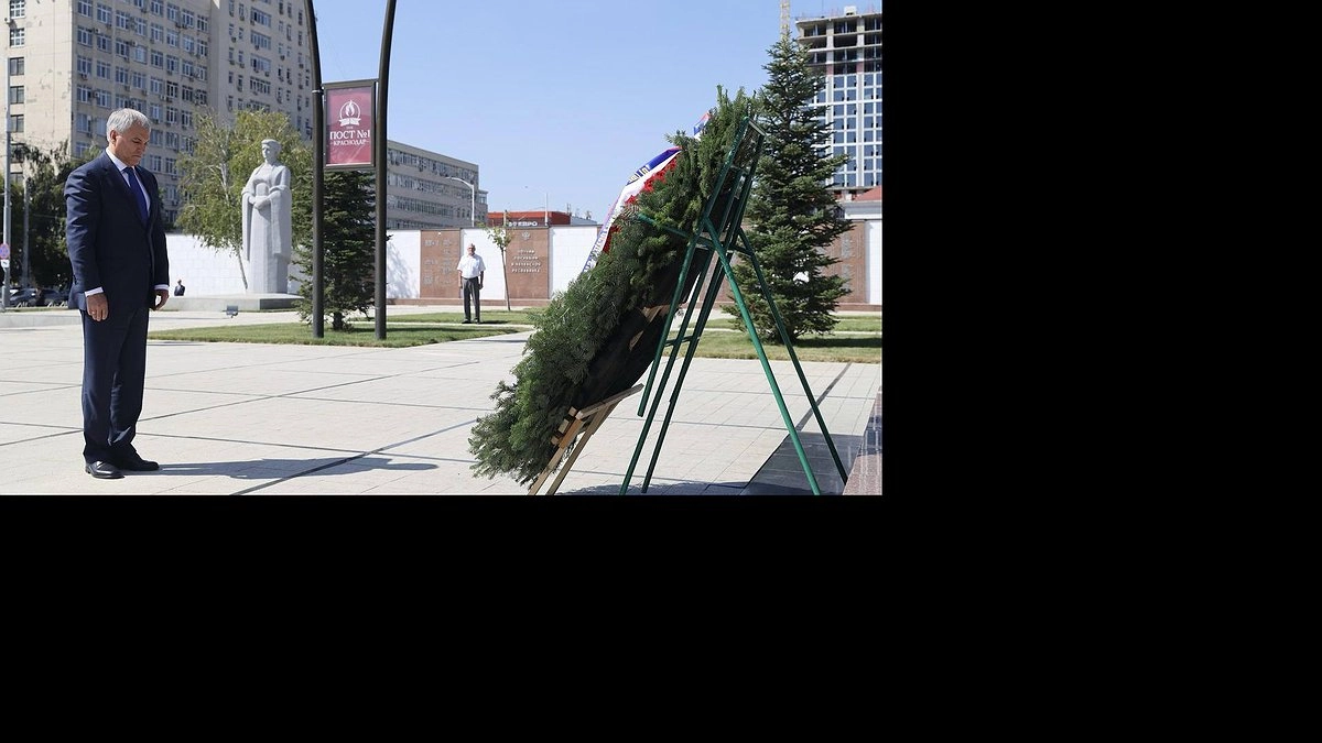 Рабочий визит начался с посещения мемориального комплекса "Площадь Памяти героев" в Краснодаре, где Вячеслав Володин и Вениамин Кондратьев почтили память павших в Великой Отечественной войне.