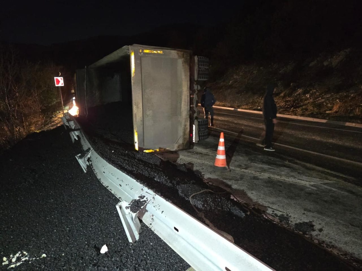 Грузовик с асфальтом опрокинулся на трассе между Новороссийском и Геленджиком, произошел разлив ГСМ.