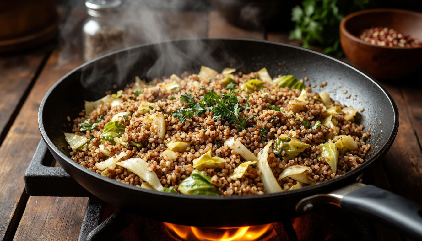 Секрет в идеальном балансе текстур. Гречка дает сытность и легкую ореховость, капуста остается чуть упругой (если не перетушить), а томатная паста добавляет приятную кислинку, которая будит аппетит. Это тот случай, когда простые продукты звучат как сложная симфония.