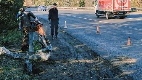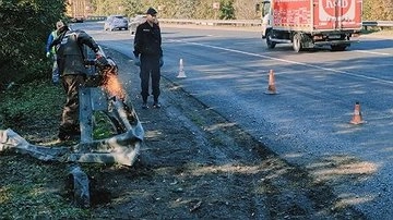 Водитель грузовика съехал с дороги и оказался в кювете. Чтобы вытащить грузовик, спасатели использовали бензорез для того, чтобы распилить леерное ограждение.