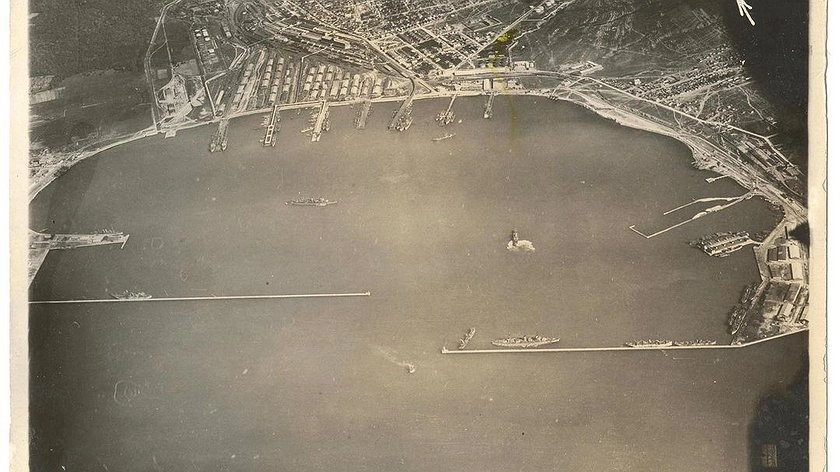В июне 1918 года в бухте Новороссийска был затоплен Черноморский флот . Незадолго до этого над портом пролетел немецкий самолет, с борта которого произвели аэрофотосъемку. На снимке можно увидеть очертания кораблей Черноморского флота.