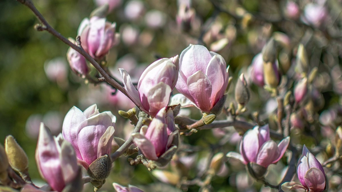 Магнолия распустилась в Абрау-Дюрсо. На кадрах видно, что ветви невысокого дерева покрыты нежно-розовыми бутонами, по форме напоминающими тюльпаны.