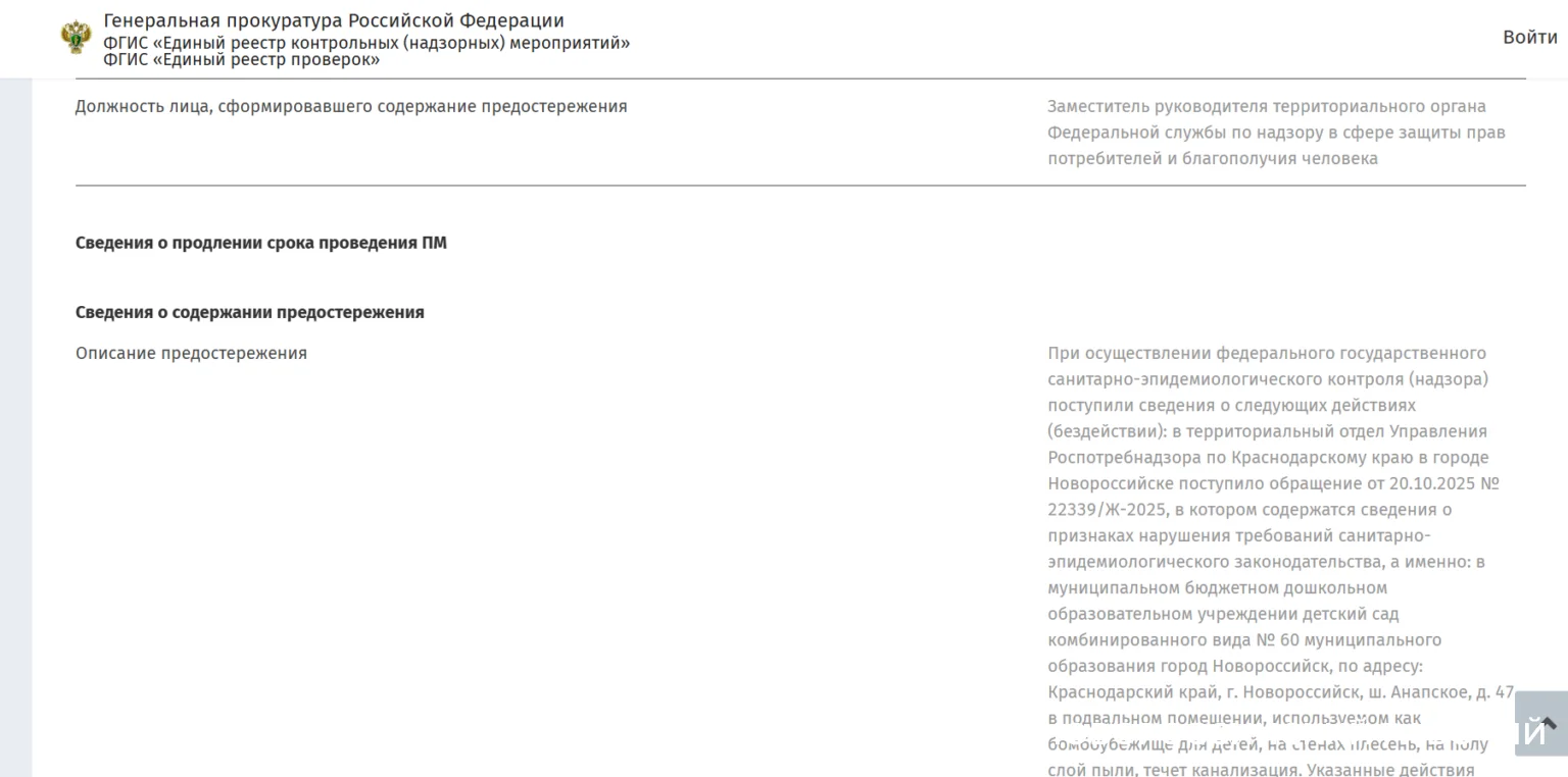 Об этом сообщает сайт Генеральной прокуратуры РФ в едином реестре проверок. Детскому саду по Анапскому шоссе, 47 уже объявлено предостережение.
