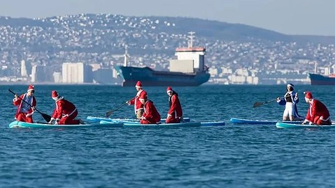 У жителей курортного села Кабардинка между Новороссийском и Геленджиком есть своя новогодняя традиция. Каждый год сапбордисты выплывают в открытое море в костюмах Деда Мороза.