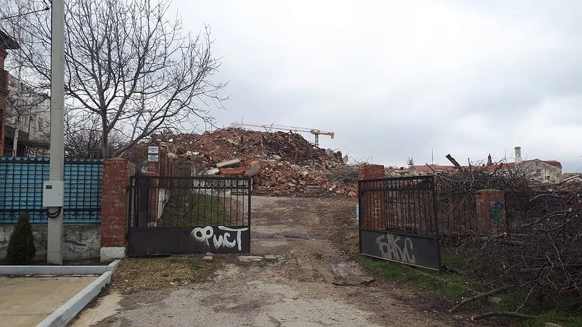 На данный момент здесь выполняются подготовительные работы для устройства котлована. Рабочие обустраивают стройплощадку, ликвидируют старый фундамент и вывозят грунт.