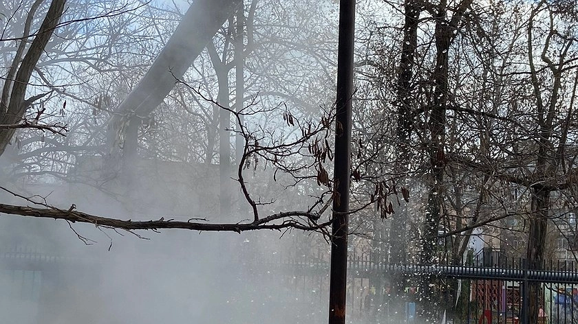На кадрах видно, что труба располагается высоко над землей. Из трещины кипяток льется на землю и на рядом припаркованные машины. По словам читательницы, спустя 20 минут после обращения в аварийную службу трубу перекрыли, позже на место приехали специалисты.