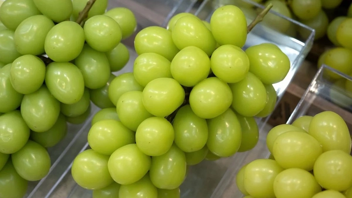 Но главная сенсация сезона — загадочный виноград из Китая. Он поражает воображение: огромные зеленые грозди с ягодами размером с помидорки черри, упакованные в целлофан с иероглифами. Продавцы сами толком не знают, что это за сорт. Журналисты с помощью нейросети попытались перевести надписи на упаковке — получилось «розовый аромат» и «Лучистый» из провинции Циндао.