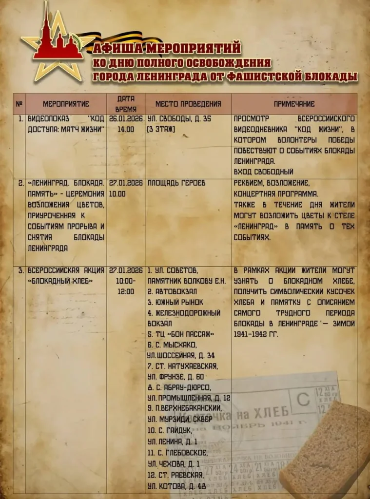 27 января город-герой присоединится к Всероссийской акции «Блокадный хлеб», чтобы почтить память жертв и защитников блокадного Ленинграда.