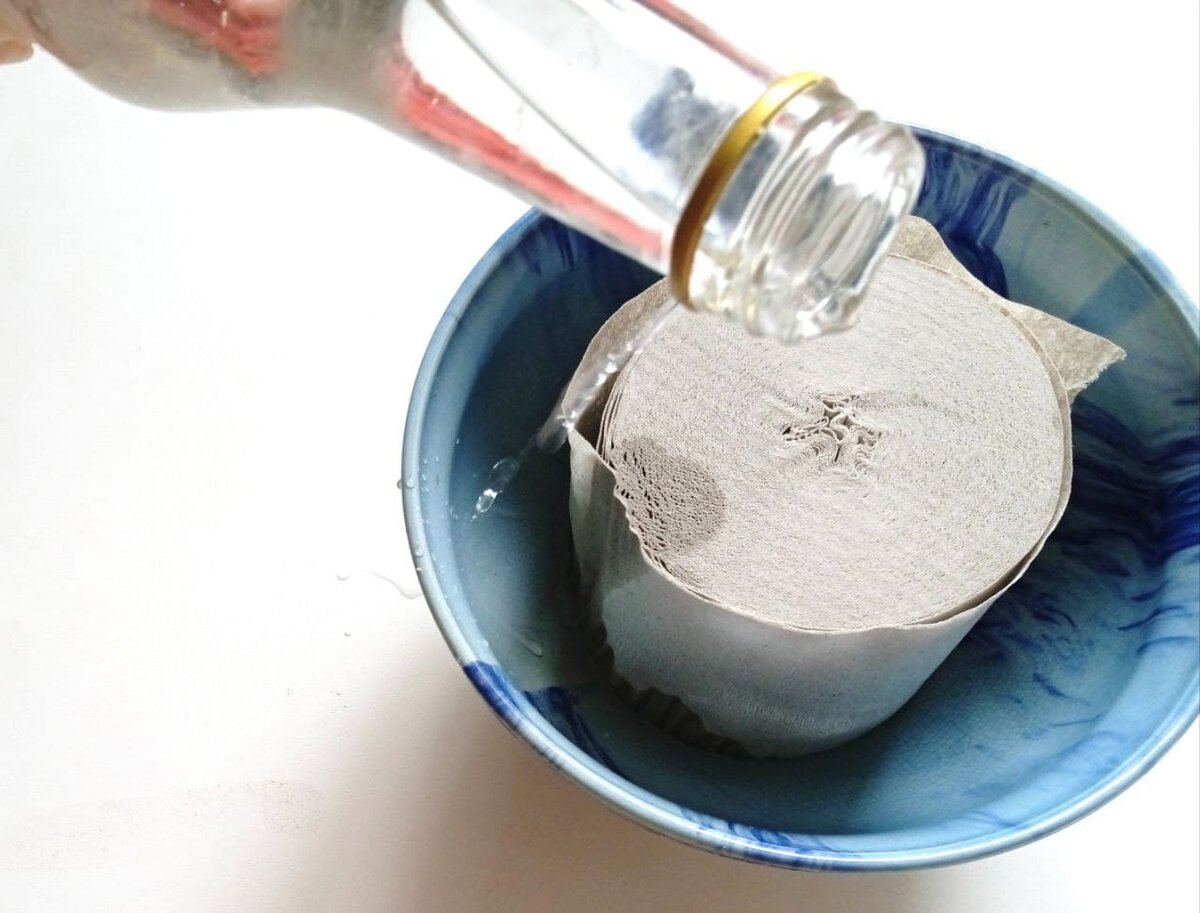 - Приготовление состава: Несколько полосок обычной туалетной бумаги обильно смачиваются 9%-ным столовым уксусом.